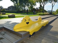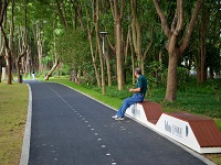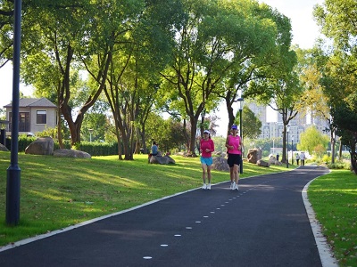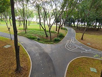 利用现状道路基础,提升并形成由跑步道与漫步道所构成的慢行绿道体系;将无障碍化贯穿整体公园道路体系,重塑一条健康友好的5.6km跑步道,同时在途经金城湾的各主要片区连接打造观光车体验道,提供不同的环湖体验视角;针对慢行绿道体系,将大量原有不合适铺装道路调整为灰色沥青路面样式,同时增加热熔点线、特色图案、专属标线等作为漫步道与跑步道的区分并提升道路景观效果。