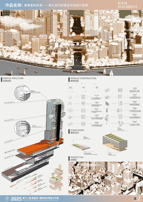 1、TOD 模式的创新实践:以像素化模块为核心的设计理念该作品的选址为无锡太湖边渔夫岛的 TOD 项目,设计以“像素化 TOD 模块”为核心理念,将整个商业空间规划为若干个可独立运作又相互关联的功能单元。该设计不仅体现了灵活性与适应性,还通过新材料、新技术的应用,赋予了空间更强的生命力与未来感。